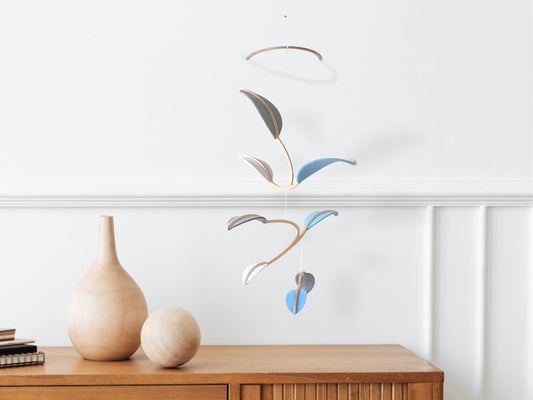 Designed for your enjoyment when viewed from any angle, as an office mobile, nursery or crib mobile, in a feature window or above a sideboard. Leaf is a very versatile mobile.