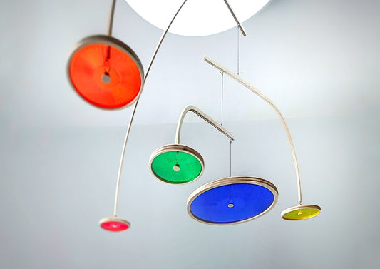 Lumo Mobile is handmade with responsibly sourced birch plywood Milled, sanded and lightly waxed. 5 laser cut & Etched Perspex disks. 1 large and 4 small. The larger Disk being 20cm in diameter, all with a detailed wooden trim.
