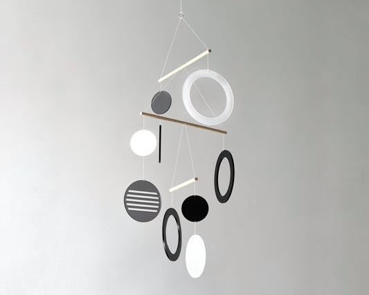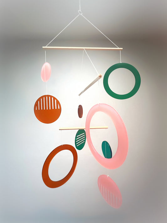 The Luna Mobile - A stunning baby and adult mobile piece of hanging kinetic art that will bring colour and joy to any room. A modern mobile handcrafted from responsibly sourced wooden dowels, this unique kinetic mobile mobile features 9 semi transparent frosted soft coloured Perspex ( safe acrylic ) disks that hang together in perfect harmony.