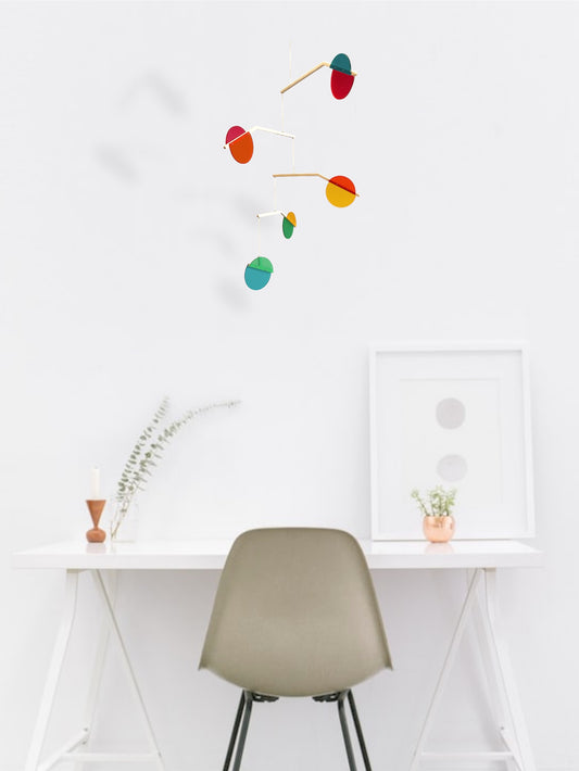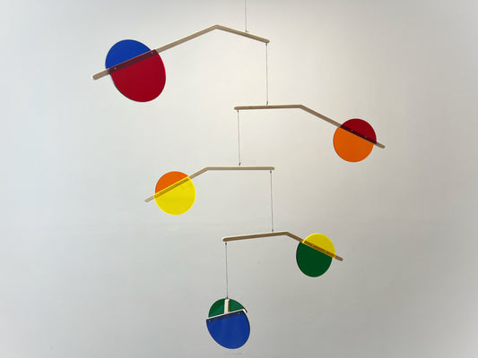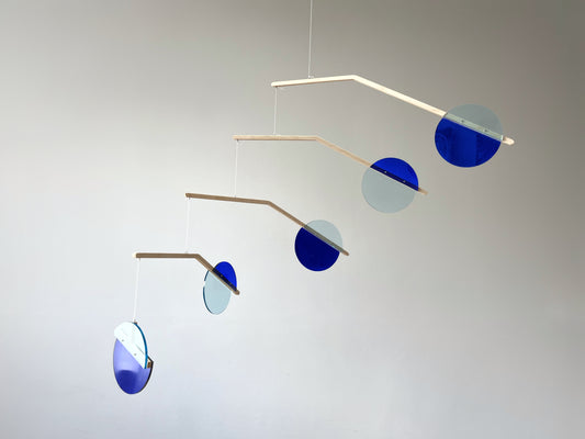 Introducing Prism Blue Mobile - a beautiful and colourful hanging kinetic mobile sculpture, designed and handmade by The Illuminist, an artist specializing in kinetic sculptures and dynamic mobiles. Inspired by the mid-century modern movement and the works of Alexander Calder, this kinetic mobile is a unique and stunning piece of cantilever hanging art that will add a touch of colour and movement to any space.